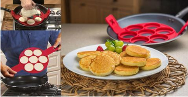 ¿Buscando el aparato perfecto y versátil para hacer comidas deliciosas instantáneamente?Estos moldes de panquecas son la manera más rápida y fácil para hacer panquecas perfectamente redondeadas, todo lo que tiene que hacer es levantar y girar. ¡Eso es todo!El silicio antiadherente ayudale a girar las panquecas sin esfuerzo.Estos moldes son diseñados para hacer la masa en la forma perfecta y con un cocimiento uniforme.En tanto que el anillo en el fondo aguanta todo. Ellos son multifuncionales:se puede utilizar para cocinar huevos perfectos, papas finas y mucho más!